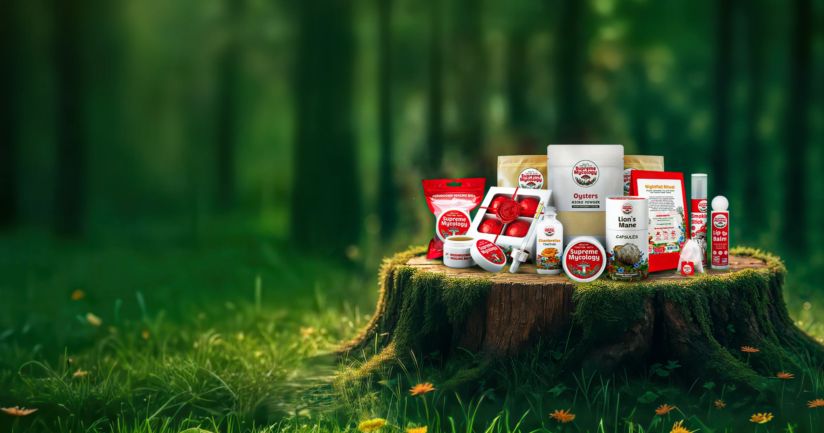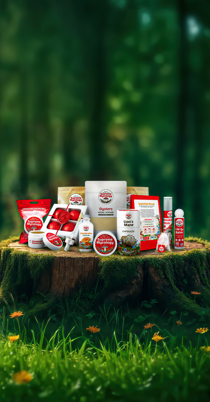 We offer a range of functional mushroom products based on Lion's Mane, Cordyceps, Chaga, Reishi, and Chanterelles. Each product is crafted to harness the unique properties of these mushrooms for various health benefits.
