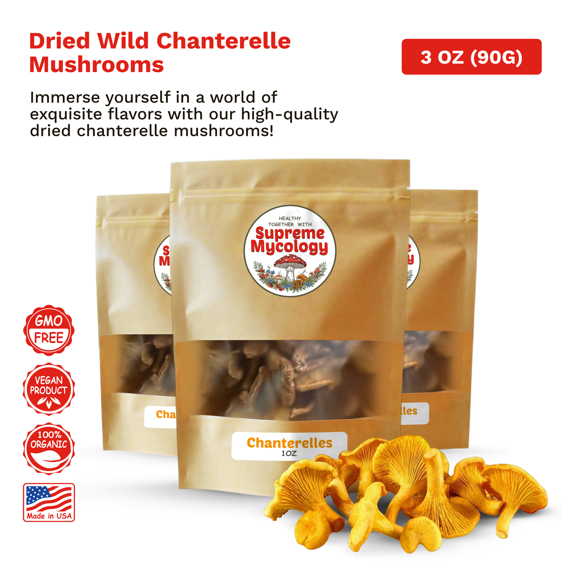 Sustainably harvested and meticulously dried to retain peak potency, our Chanterelles reflect Supreme Mycology’s dedication to nature’s purest gifts for health and harmony.